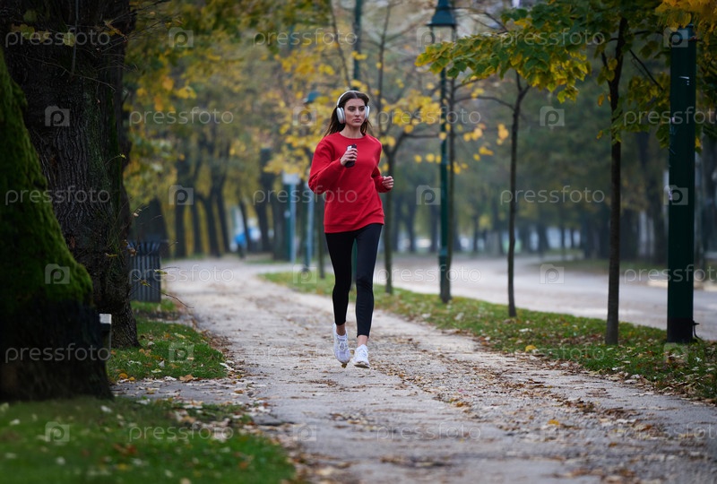 Молодая красивая женщина бежит в осеннем парке и слушает музыку в наушниках на смартфоне