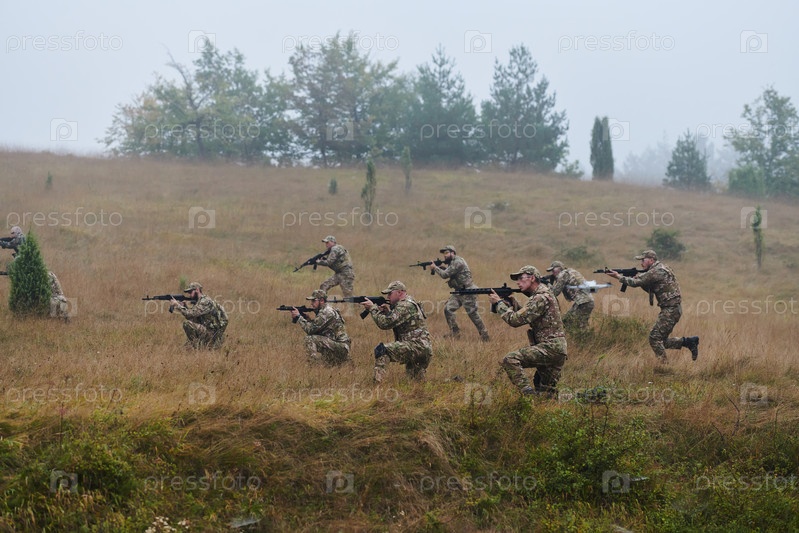 Дисциплинированное и специализированное военное подразделение, облаченное в камуфляж, осуществляющее стратегическое патрулирование и сохраняющее контроль в обстановке с высокими ставками, демонстрирующее свою точность, сплоченность и готовность к специаль