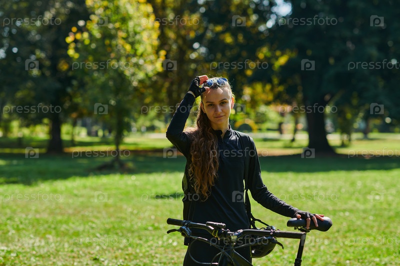 В лучезарных объятиях солнечного дня радостная девушка, облаченная в профессиональную велосипедную экипировку, находит чистое блаженство и жизненную силу, катаясь по парку на своем велосипеде, а ее заразительный смех отражает беззаботную гармонию момента
