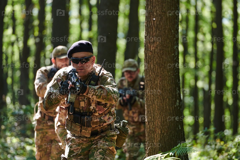 Специализированное военное антитеррористическое подразделение проводит секретную операцию в густом, опасном лесу, демонстрируя точность, дисциплину и стратегическую готовность