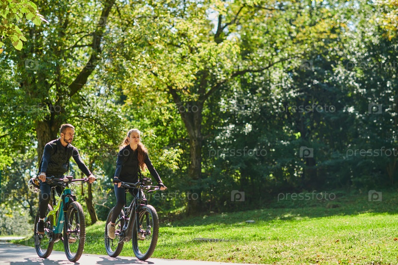 Счастливая пара, одетая в профессиональную велосипедную экипировку, наслаждается романтической велопрогулкой по парку, окруженному современными природными достопримечательностями, излучая любовь и счастье
