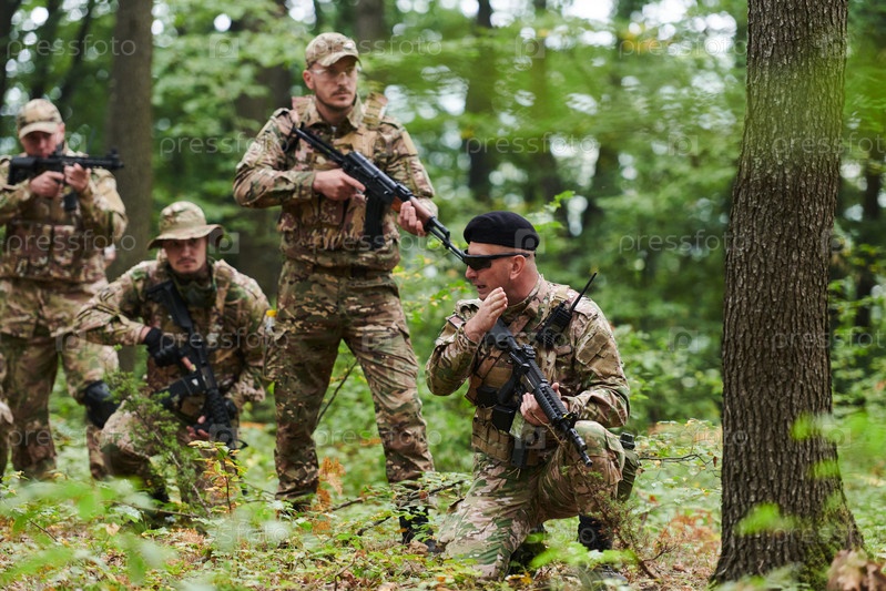 Дисциплинированное и специализированное военное подразделение, облаченное в камуфляж, осуществляющее стратегическое патрулирование и сохраняющее контроль в обстановке с высокими ставками, демонстрирующее свою точность, сплоченность и готовность к специаль