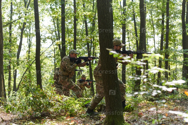 Специализированное военное антитеррористическое подразделение проводит секретную операцию в густом, опасном лесу, демонстрируя точность, дисциплину и стратегическую готовность