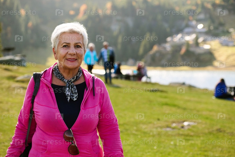 Пожилая женщина обретает спокойствие и благополучие во время прогулки на природе, демонстрируя красоту активного и здорового образа жизни в ее золотые годы