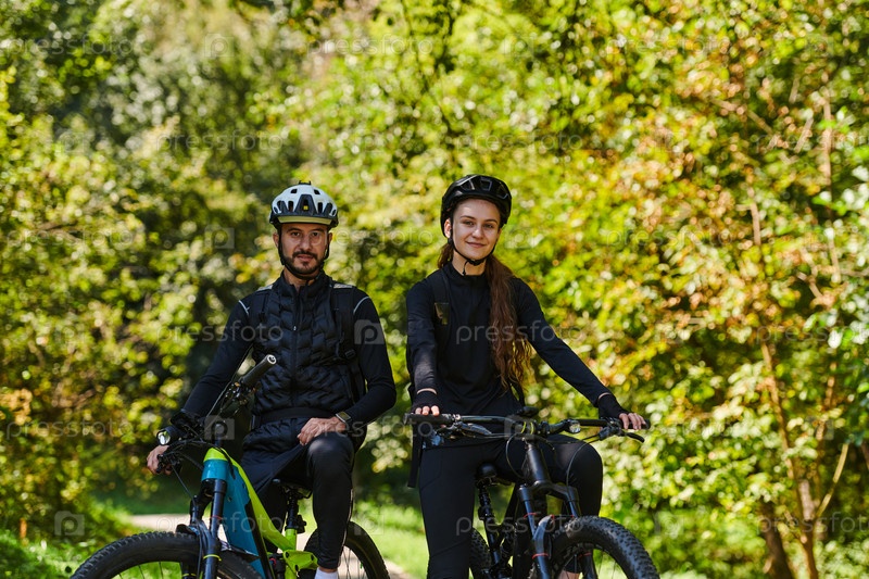 Счастливая пара, одетая в профессиональную велосипедную экипировку, наслаждается романтической велопрогулкой по парку, окруженному современными природными достопримечательностями, излучая любовь и счастье