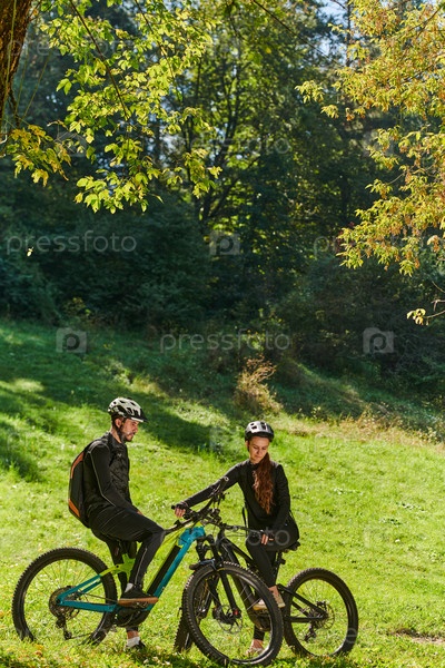 Милая парочка, вооруженная велосипедами и поглощенная планированием своего путешествия, проверяет свои мобильные телефоны и часы, планируя живописные маршруты в парке, органично сочетая технологии и приключения на свежем воздухе для восхитительного опыта