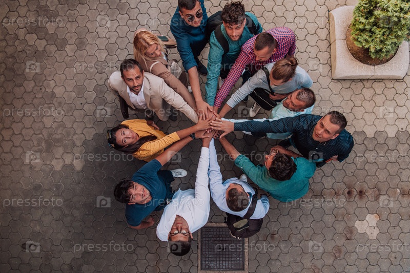 Фотография сверху, на которой изображена группа деловых людей и коллег, стоящих вместе, держась за руки и смотрящих в камеру, что символизирует единство и командную работу