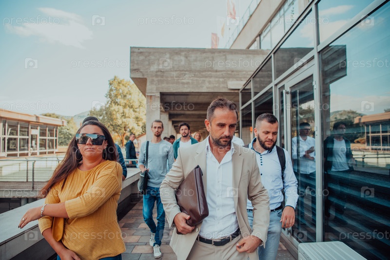Группа бизнесменов и коллег из разных слоев общества прогуливается по своему рабочему месту, демонстрируя сотрудничество и командную работу в компании