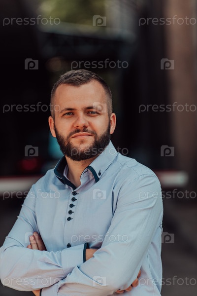 Успешный молодой бизнесмен в рубашке, скрестив руки, позирует на открытом воздухе с уверенным выражением лица