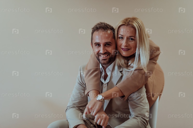 Пара бизнесменов позирует для совместной фотографии на бежевом фоне, запечатлевая свое профессиональное партнерство и создавая вневременной образ единства и успеха