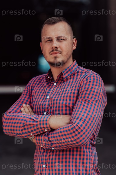 Успешный молодой бизнесмен в рубашке, скрестив руки, позирует на открытом воздухе с уверенным выражением лица