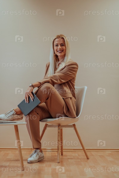 Профессиональная бизнес-леди сидит на стуле на спокойном бежевом фоне, усердно работая на своем ноутбуке, демонстрируя преданность делу и сосредоточенность на достижении успеха