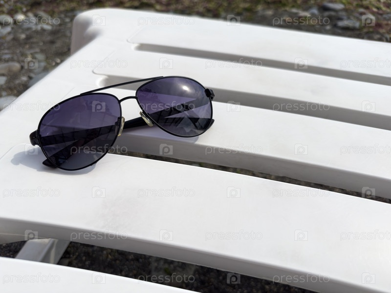Солнцезащитные очки лежат на белом шезлонге на открытом воздухе, залитом солнцем