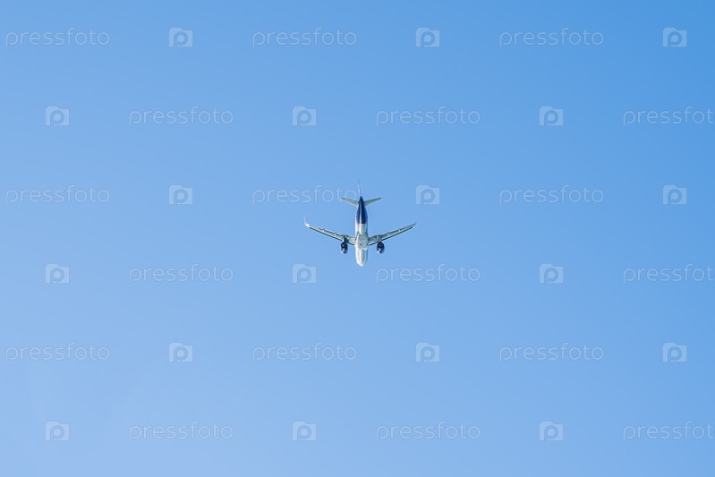 Самолет летит на фоне голубого неба