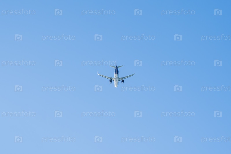 Самолет летит на фоне голубого неба