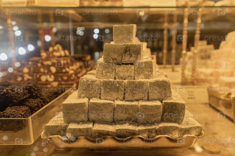 Кондитерские изделия в витрине крупным планом