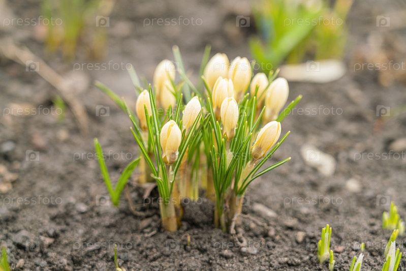 Желтые крокусы крупным планом на красивом фоне