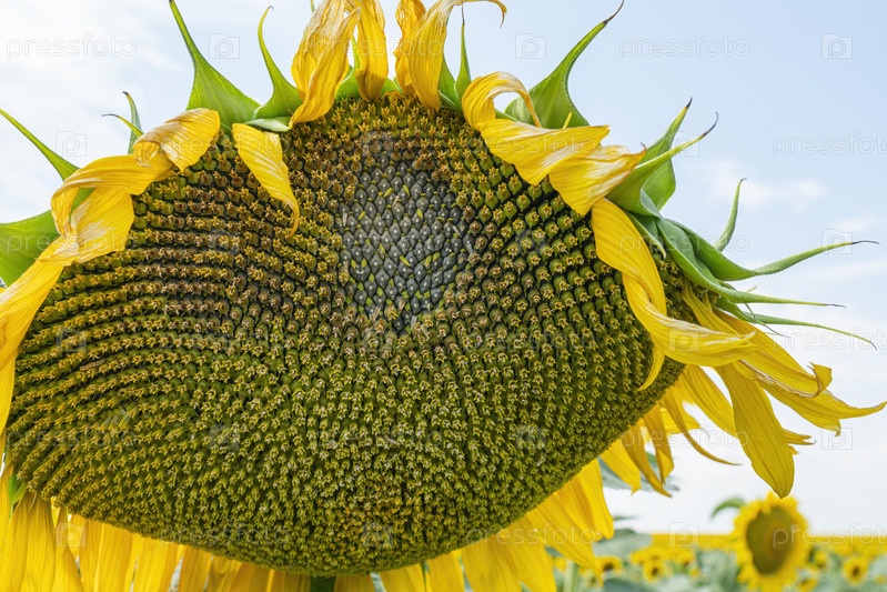 Подсолнух и поле подсолнухов на фоне голубого неба