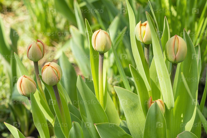 Нераскрывшиеся бутоны оранжевых тюльпанов в саду