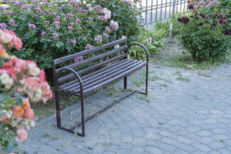 Пустая скамейка на улице, окруженная розами