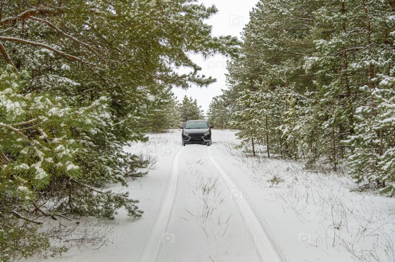 Машина на заснеженной дороге в зимнем лесу