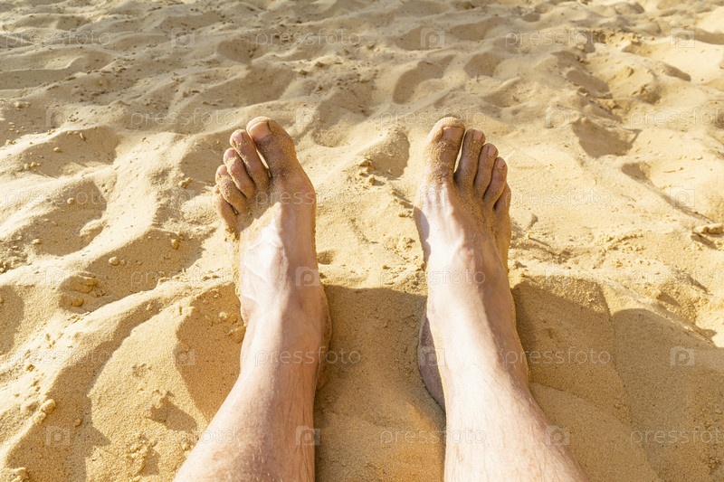 Ноги отдыхающего мужчины на песке крупным планом
