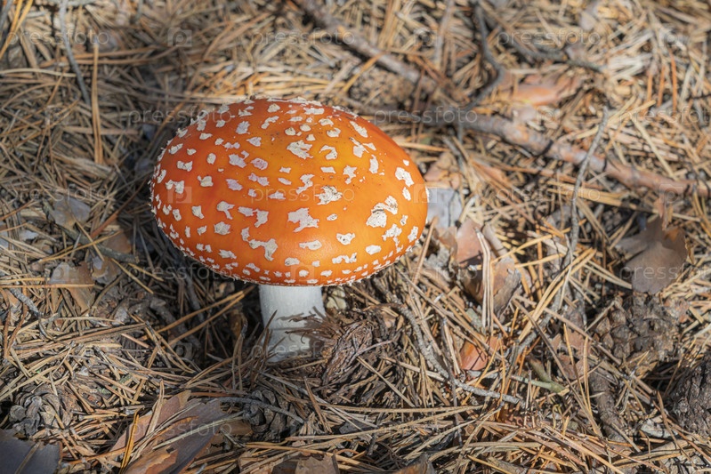 Гриб мухомор крупный план в сосновом лесу