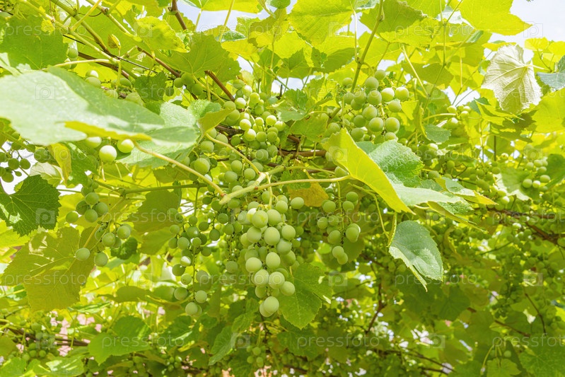 Молодые зеленые гроздья винограда на лозах