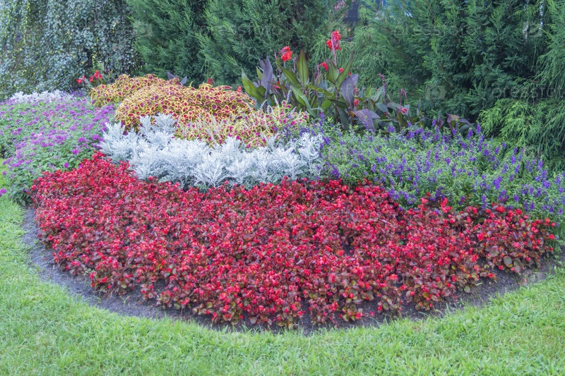 Клумбы с разноцветными цветами и растениями крупным планом