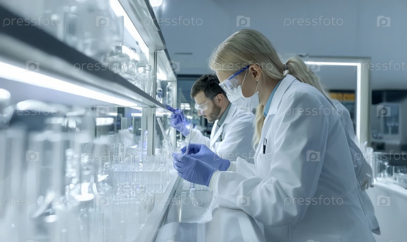 Разнообразная команда мужчин и женщин-ученых-медиков, работающих над новыми фармацевтическими продуктами в современной лаборатории. Сгенерированное изображение