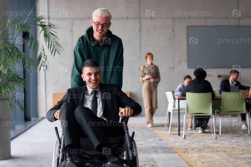Сотрудник развлекает директора в инвалидной коляске, катаясь по офису со смехом и радостью
