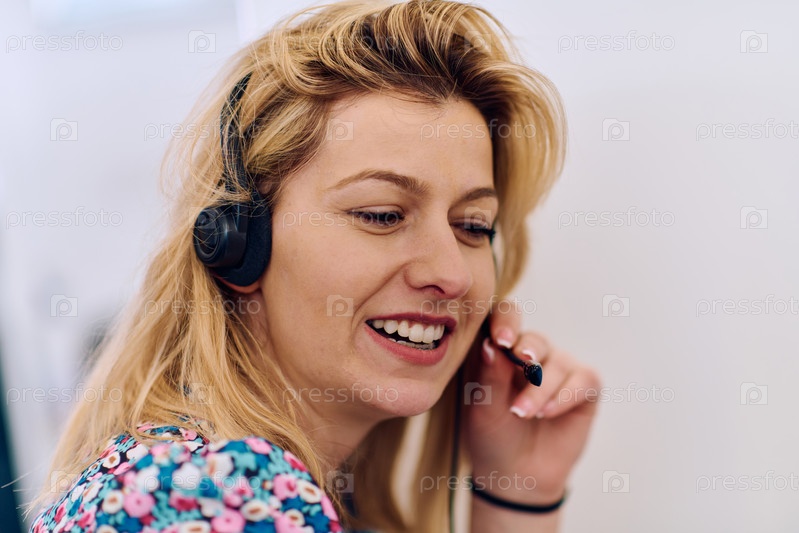 Дружелюбный агент колл-центра отвечает на входящие звонки с помощью гарнитуры и обеспечивает удаленное обслуживание клиентов