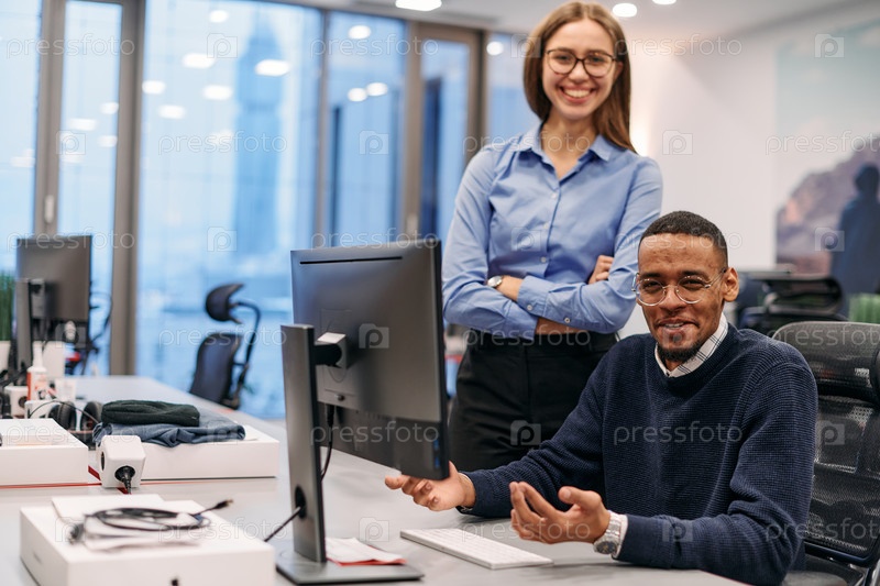 Цифровое сотрудничество: светловолосая бизнес-леди и ее партнер-афроамериканец просматривают документы онлайн