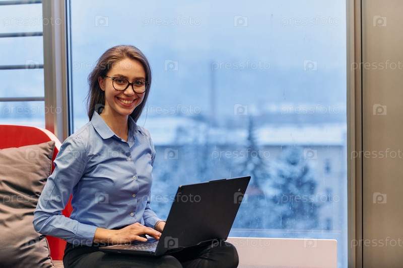 Деловая женщина пользуется ноутбуком, сидя у окна большого корпоративного здания, на фоне которого открывается живописный вид на городской пейзаж