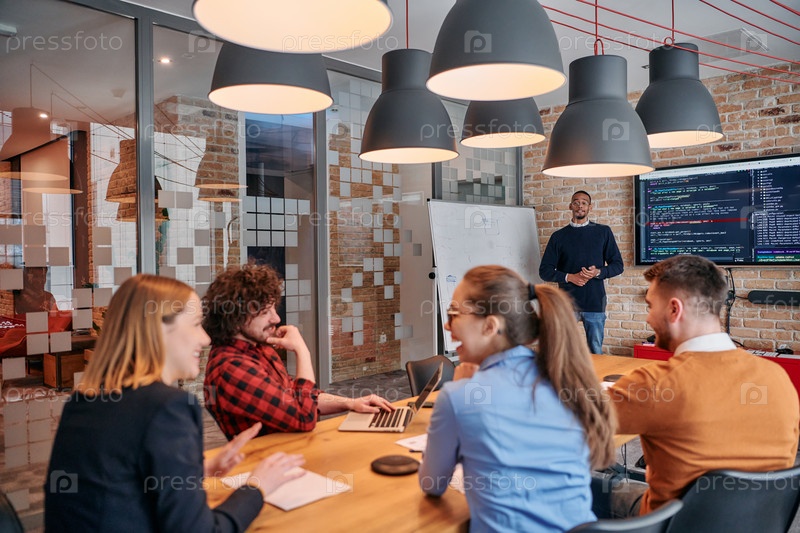 Афроамериканский бизнесмен проводит совещание, страстно представляя бизнес-план своей внимательной команде, способствуя сотрудничеству и стратегическому мышлению