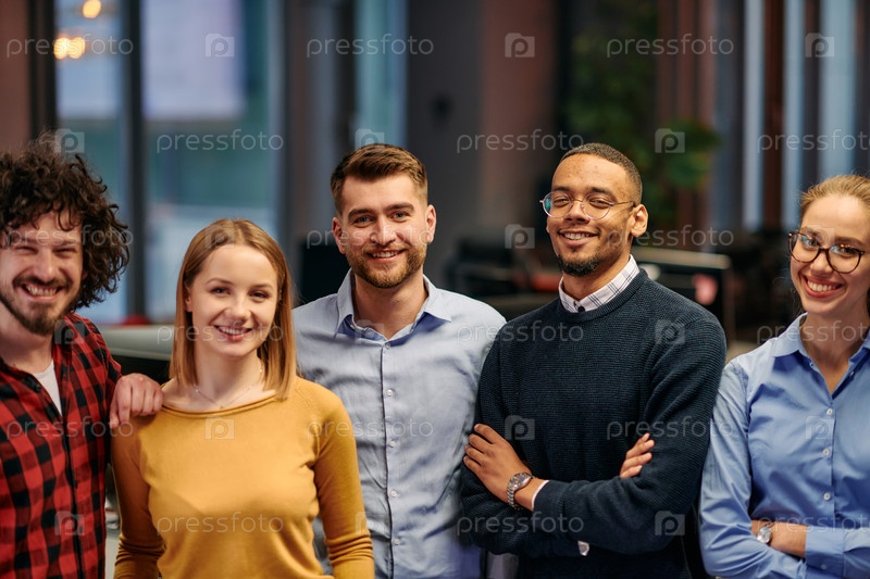 Портрет успешной творческой бизнес-команды, смотрящей в камеру и улыбающейся. Разнообразные деловые люди, стоящие вместе на старте. Избирательный фокус