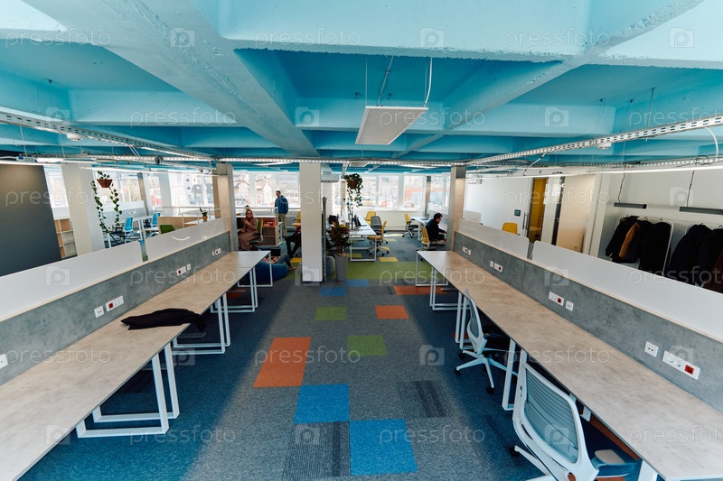 Фотография современного офиса, где выполняются проекты по программированию, цифровому маркетингу и веб-дизайну. Офис с современной мебелью и стеклянным офисом