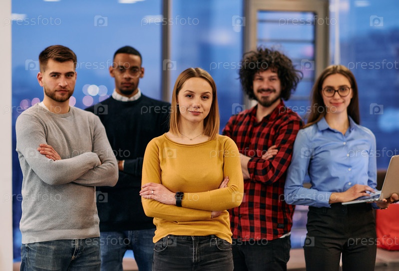 Портрет успешной творческой бизнес-команды, смотрящей в камеру и улыбающейся. Разнообразные деловые люди, стоящие вместе на старте. Избирательный фокус