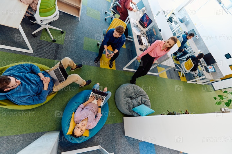 В современном офисе стартапа разнообразная группа молодых и способных бизнесменов ведет оживленные обсуждения различных проектов, демонстрируя командную работу, инновации и предпринимательский дух