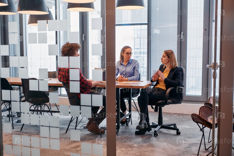 В динамичной суете деловой среды группа молодых специалистов идет по коридору рядом со своим офисом, в то время как их коллеги сотрудничают внутри, что символизирует командную работу и производительность