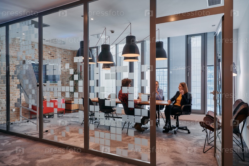 В динамичной суете деловой среды группа молодых специалистов идет по коридору рядом со своим офисом, в то время как их коллеги сотрудничают внутри, что символизирует командную работу и производительность