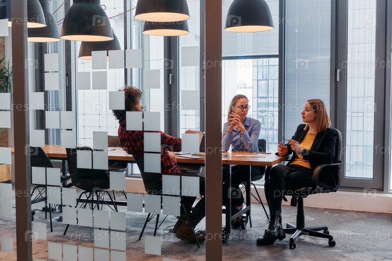 В динамичной суете деловой среды группа молодых специалистов идет по коридору рядом со своим офисом, в то время как их коллеги сотрудничают внутри, что символизирует командную работу и производительность