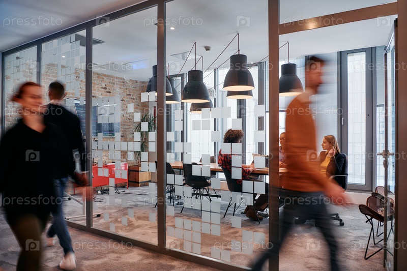 В динамичной суете деловой среды группа молодых специалистов идет по коридору рядом со своим офисом, в то время как их коллеги сотрудничают внутри, что символизирует командную работу и производительность