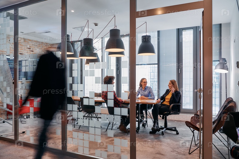 В динамичной суете деловой среды группа молодых специалистов идет по коридору рядом со своим офисом, в то время как их коллеги сотрудничают внутри, что символизирует командную работу и производительность
