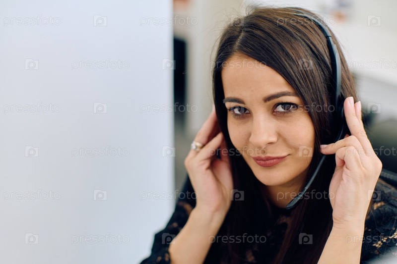 Дружелюбный агент колл-центра отвечает на входящие звонки с помощью гарнитуры и обеспечивает удаленное обслуживание клиентов