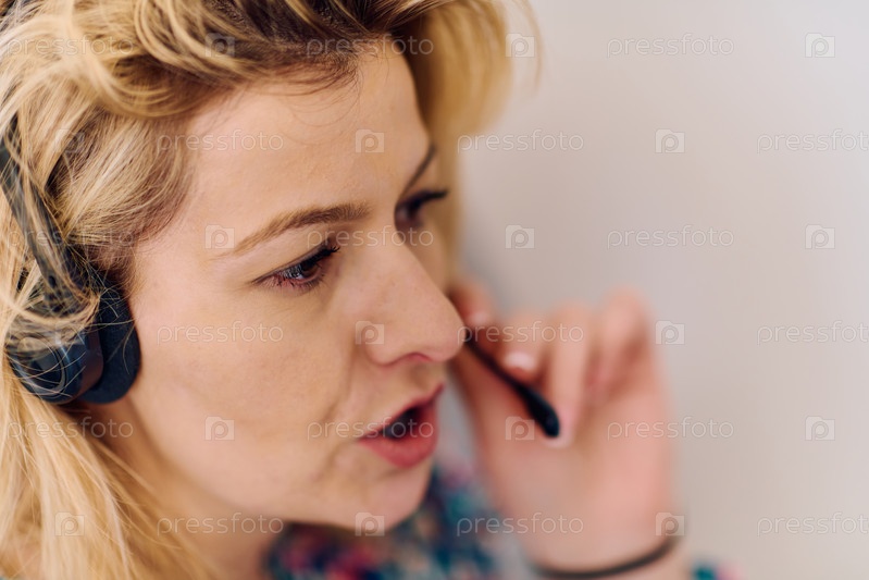 Дружелюбный агент колл-центра отвечает на входящие звонки с помощью гарнитуры и обеспечивает удаленное обслуживание клиентов