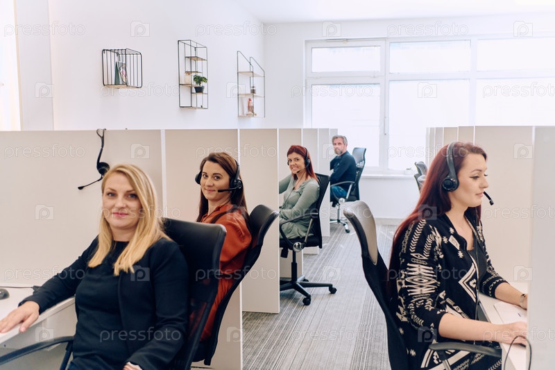 Команда женщин, оказывающих поддержку клиентам в колл-центре