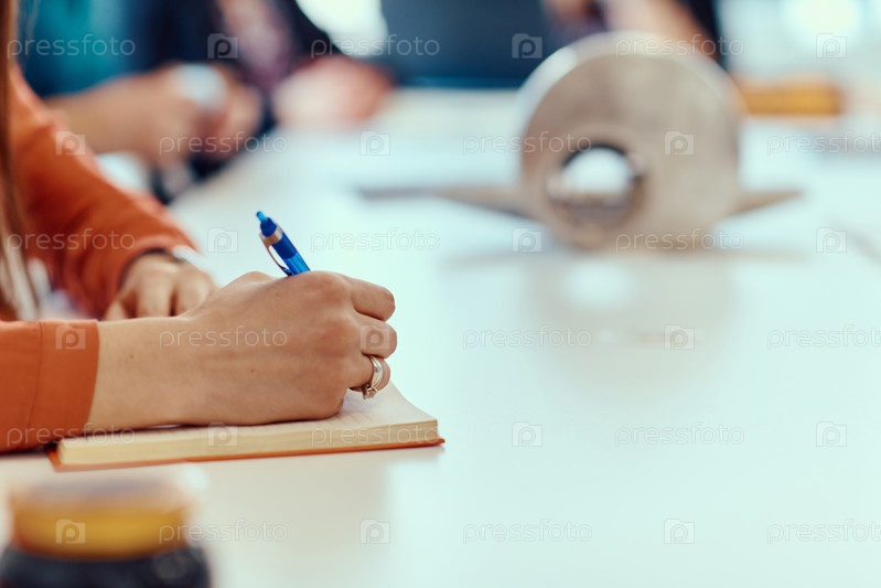 Крупный план женской руки, держащей карандаш, готовой к заметкам на совещании
