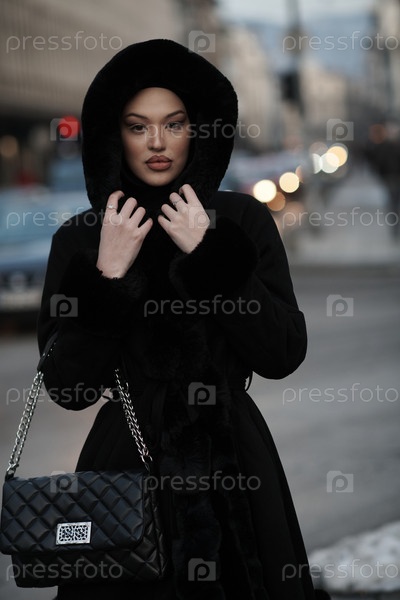 Мусульманка идет по городской улице холодной зимней ночью в хиджабе