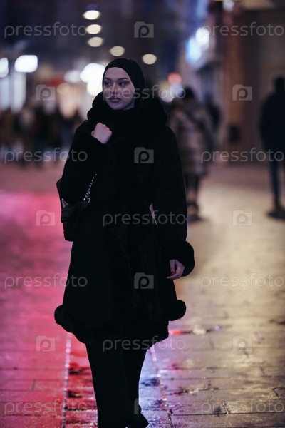 Мусульманка идет по городской улице холодной зимней ночью в хиджабе